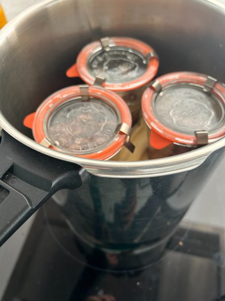 Gläser in den Schnellkochtopf stellen, Wasser hinzufügen und bei vollem Druck 30 Minuten einkochen. Beim Einkochautomaten entsprechend länger.